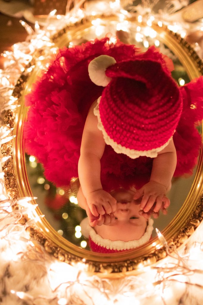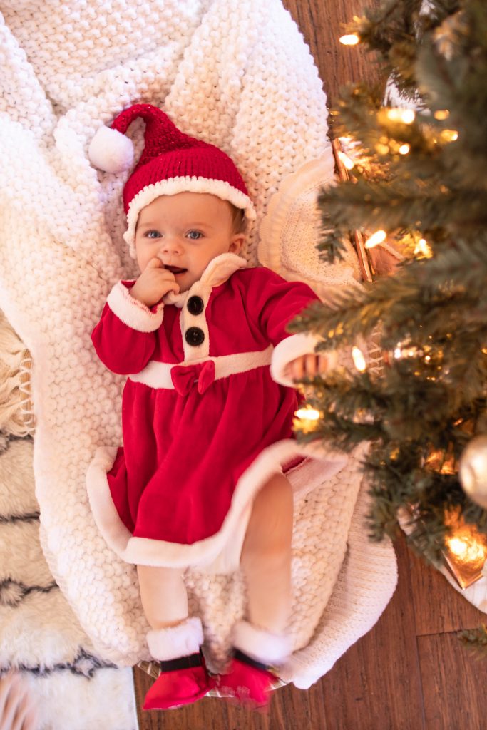 If your little babes are anything like mine, they LOVE being outside. The sky, fresh air, so many things to look at, being outside can make for some of the most magical candid shots (my favorite kind). Take your baby’s first Christmas photoshoot outside for the best lighting, and to find how much easier it can be to keep your little one engaged you while trying to capture their sweet face.