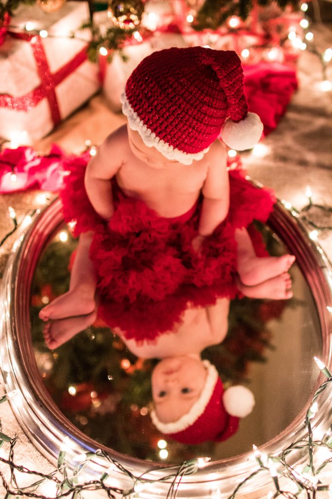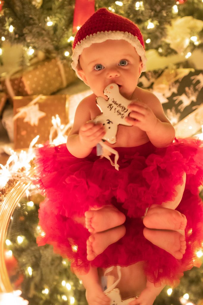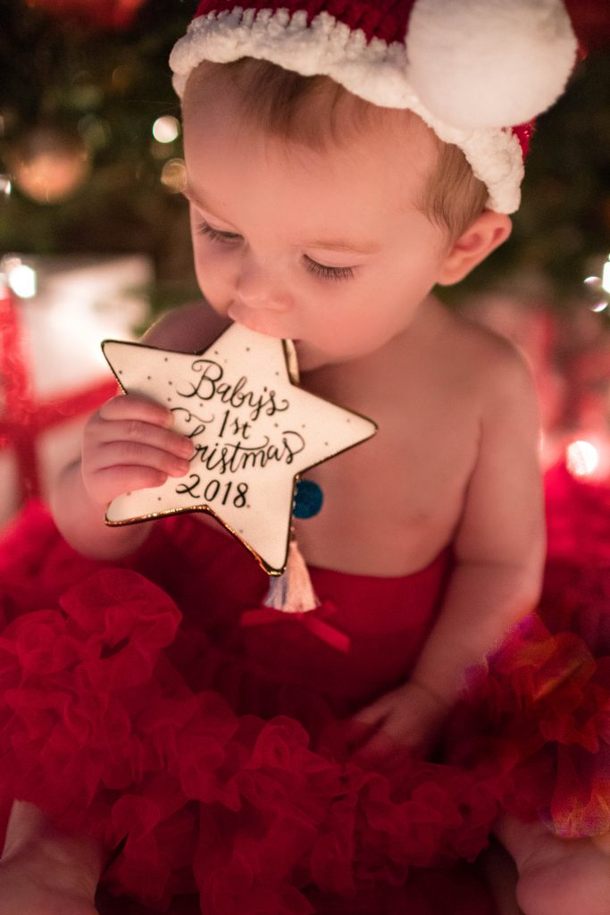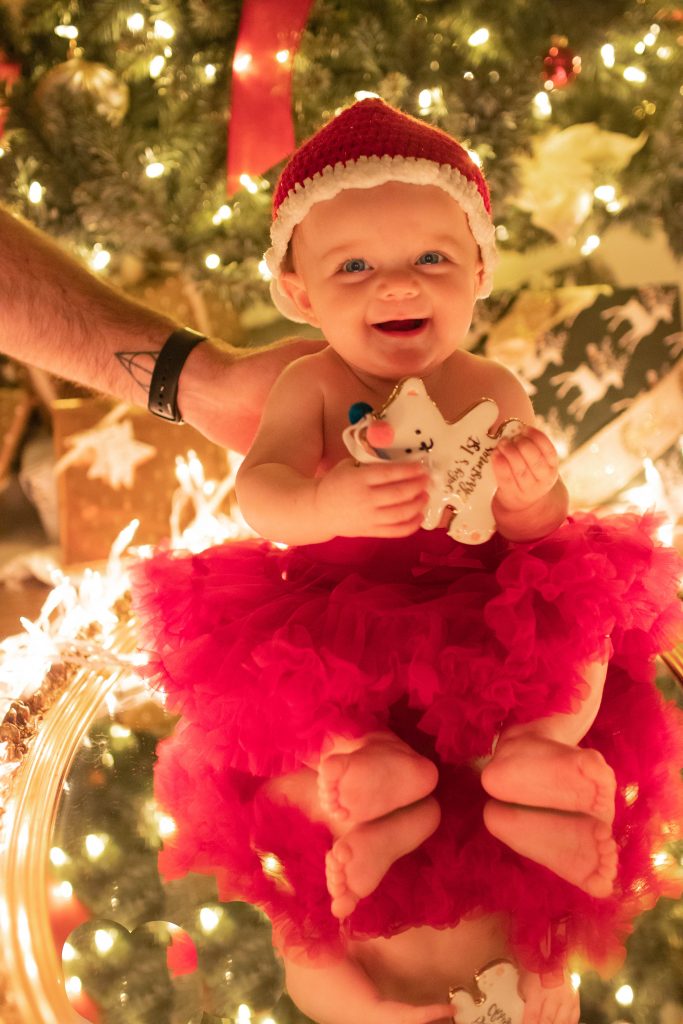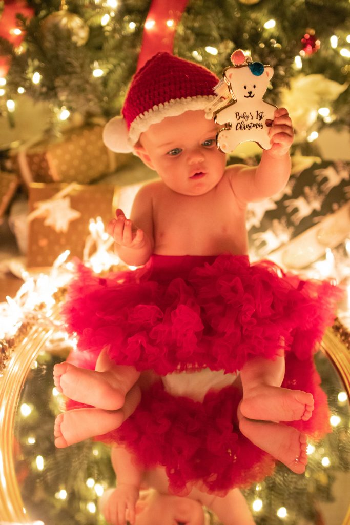 This is something I highly recommend to have for capturing these priceless memories. This is your little one’s first experience of the most magical time of the year, so commemorate it with their very own first Christmas ornament to have for the rest of their lives. It doesn’t have to be store bought. Make one for them if you can. Be sure to have it at the ready when you are going to do this photo shoot because it is fun capturing them interacting with it at this baby stage, and, after all, it is their first ornament ever! Just look at Caroline’s sweet little baby fingers wrapped around hers!! <3