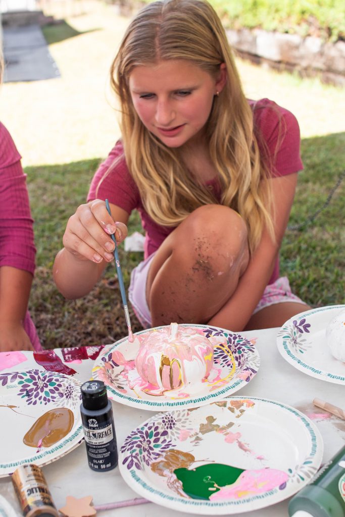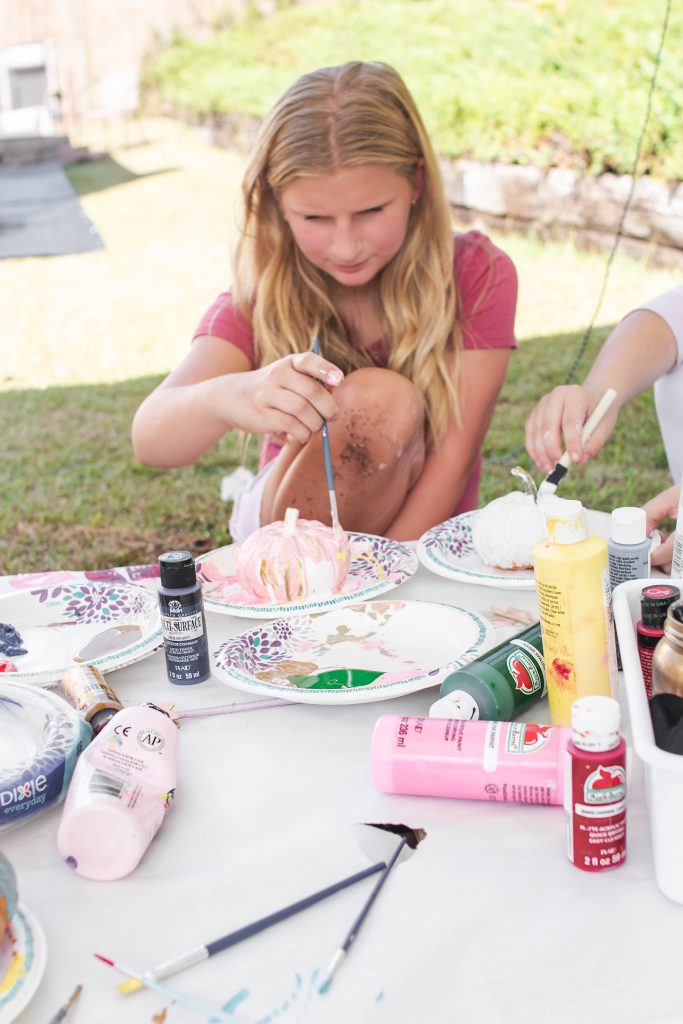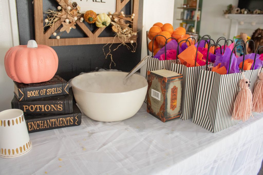Although we had the snack activity, I also setup stations to decorate your own pumpkin, decorate your own wand, and Ashley brought Halloween pennants for everyone to decorate. I supplied mini pumpkins but also recommended everyone to bring one and paint as a family to take home for decoration.