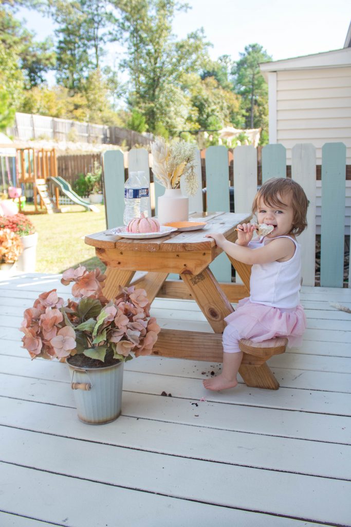 The Halloween decorations were for the kids, but I honestly get so much joy out of putting them together. I always wanted to have a little picnic table and found this party was the push I needed to bring my vision to life. The long white picnic table is built from scrap wood and hair pin legs from Lowe’s. Hopefully I will have a quick tutorial on it soon for ya! The super easy macaroon stand DIY that I made the first time for this party made a reappearance. I recreated the stands and bought our favorite freshly baked macaroons from Publix bakery.