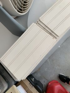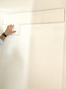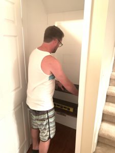 After measuring and cutting, Morgan brought in the pieces to ensure they would fit properly. If you are ever uncertain, I always suggest over measuring slightly so that you have to continue to trim the board, otherwise the board is too short and could be unusable. Luckly, most of the cuts were perfect so he continued to measure all the way down the closet, cutting each row as he went, making sure it would fit properly, and so on until the entire wall was done. I won’t go into the minutiae of our measurements because our closet was a little wonky. It actually got a little more narrow toward the bottom so I’m glad he decided to do it piece by piece. It would have meant a good bit of wasted shiplap if he hadn’t. He did the entire back of the wall first, and then the two side. I recommend doing it that way because then the two side overlap the back wall where they meet in the corners and I think that way looks much better and cleaner than the back overlapping the sides.