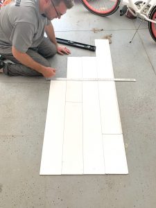 About halfway through Morgan getting the planks cut I realized the shiplap was a bit dirty, and not a true white, so I went ahead and painted them with an exterior white to ensure a clean, cohesive color. I originally thought buying them already white would save me a job, but ultimately painting is inevitable for almost any home remodeling job. I don’t really recommend the shiplap we used only due to the price, but we did like it because it had the interlocking ridges which made it much easier to have that line separation between each board. If you read other tutorials you’ll notice when they place their planks they use quarters or something small and thin as spacers to give that equal separation between the shiplap planks, but with the ones we bought you were able to skip that step. They locked in perfectly and had the straight lines that charming shiplap walls have when done properly.
