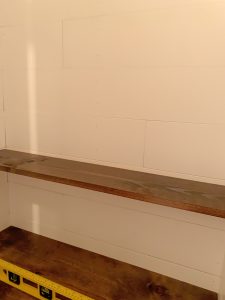 You can see in the picture above how he did the offset pattern I wanted, and I decided I really like the way the raw nail looked so I left it like that instead of puttying and painting over them like many do. While Morgan was completing the ship lap installation I was staining the shelves and shelf brackets with the Jacobean stain and foam brush. It usually needs to dry overnight so I wanted to start as soon as I finished painting the shiplap.