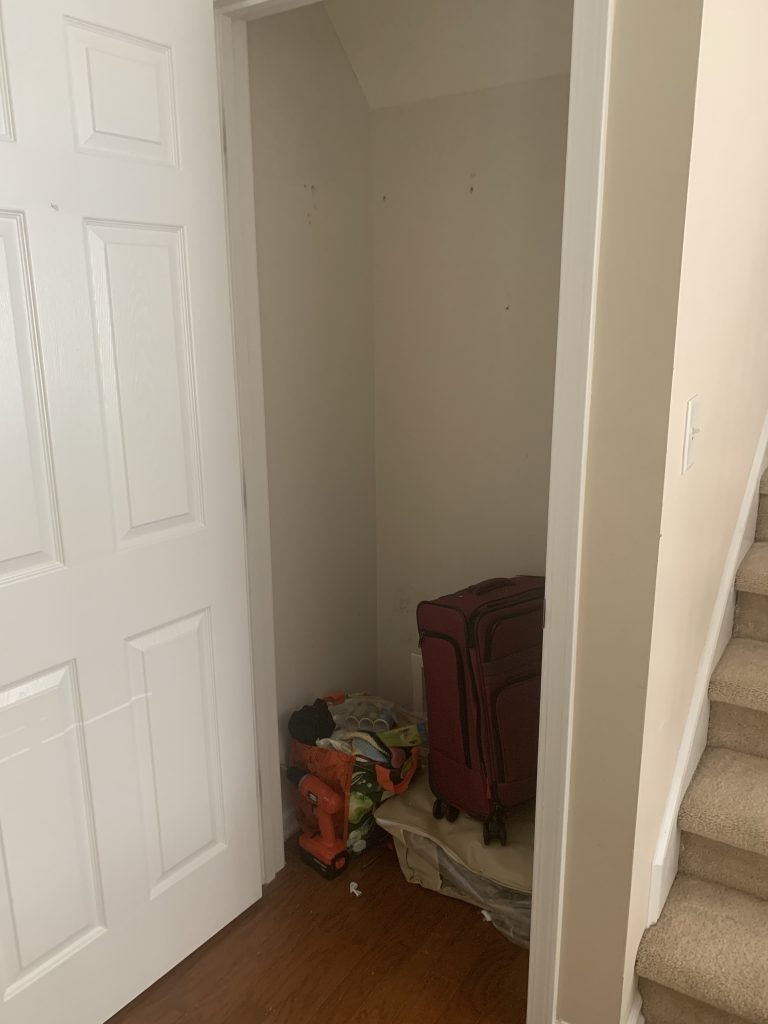 First we had to clean out the closet and actually start organizing our junk after moving in ( WELL OVERDUE). We took down the one wired shelf that was mounted in there and painted the entire inside of the closet white from the beige and scuffed colors it was. See before pics below. Don’t mind the randoms. He had many people helping us move in and it was a little chaotic so I just started telling people to put things in random closets and I would go through them later… oopsies. 🙂