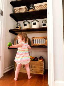 We also decided to leave a little more space at the bottom because I am pretty sure over time I will find more cute crates and baskets to stack under there for produce and things. Currently it is one of Caroline’s favorite places to play, and take baby bites in the potatoes and puts them back for us to later find and see two little teeth marks in. 🙂