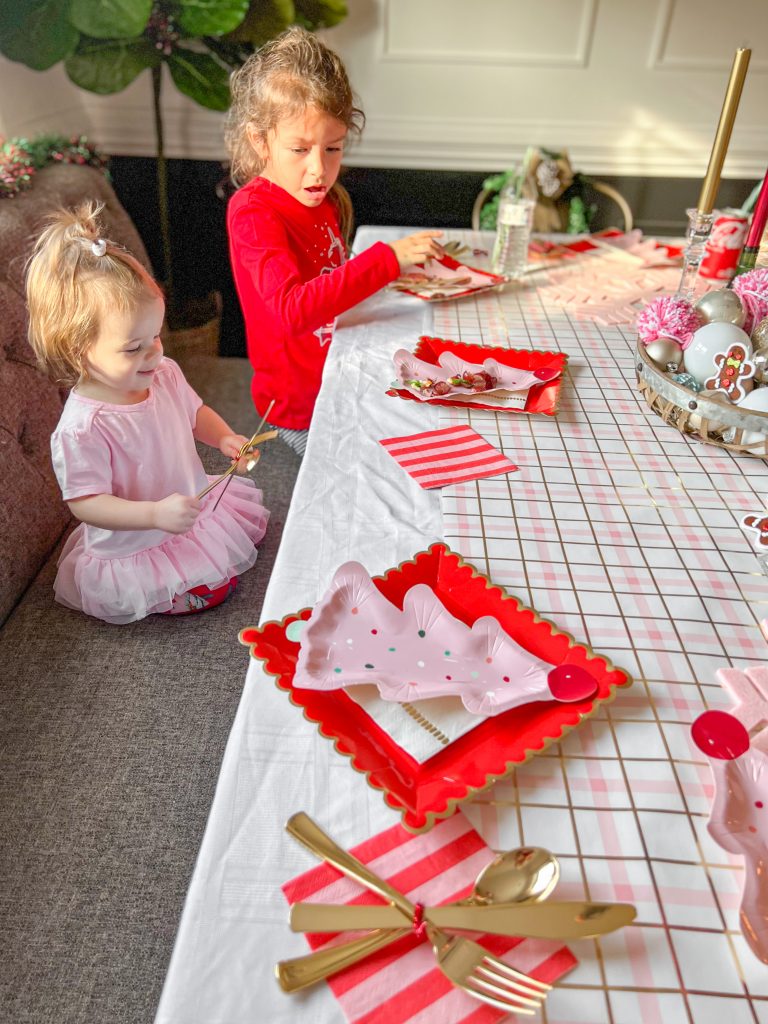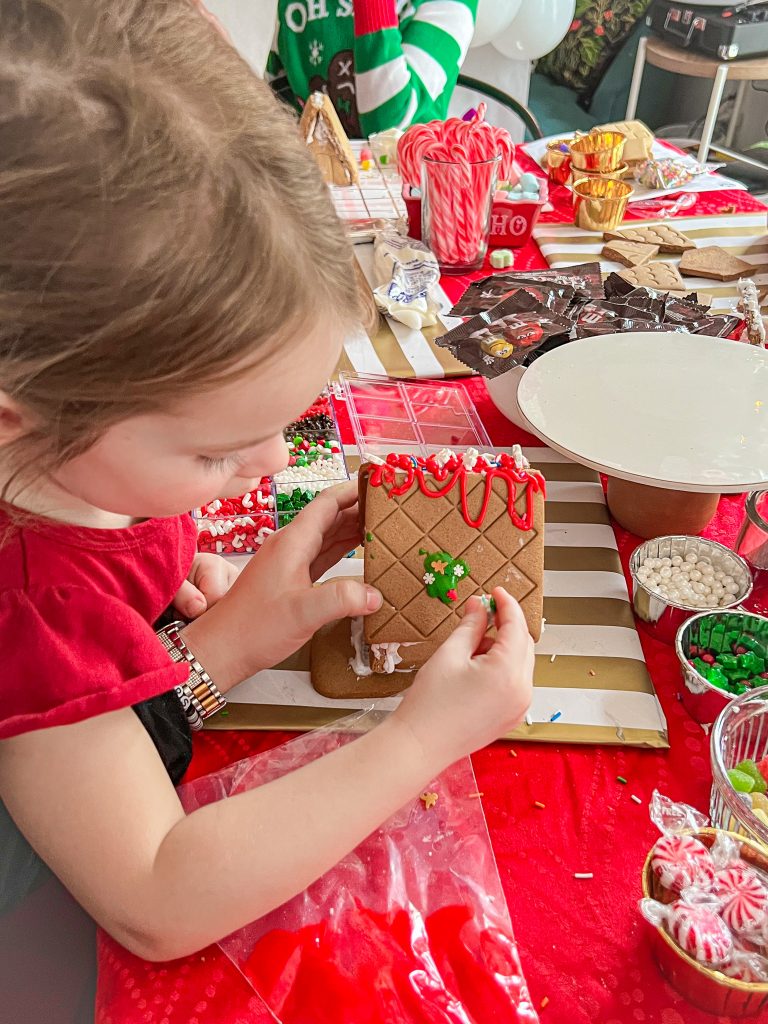 Piecing this party together was nothing short of pure joy for me and I learned a lot (as I do at almost every event). Things like, don’t ever try to cram an activity table in the living room again Nicki because you just don’t have the space GF!! Trying to help the youngsters with their houses proved to be a little difficult for adults because of the lack of space. We made do but each party adds another tick mark to the “live and you learn” column for me. Decorating a gingerbread house proved to be much more meticulous than I realized, but the kids seemed to really love it. In the end it was a smash hit and I look forward to planning more for my girls and family to enjoy for years to come!