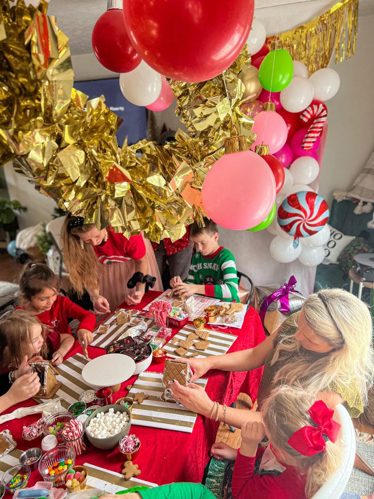 There are SO many reasons why I love this time of year, but I can honestly say that the fun, endless holiday parties I can plan make it even more magical and exciting. This year I landed on Gingerbread House Making Christmas Party where parents and kids could work together and build their houses! I had to admit at the beginning of the party that I personally had never made a gingerbread house myself. Maybe secretly I threw the party to force us into giving me the experience for the first time. Either way, it was a ton of fun and definitely something I want to try and throw for years to come. The kids were SO creative and even some parents got really into it!