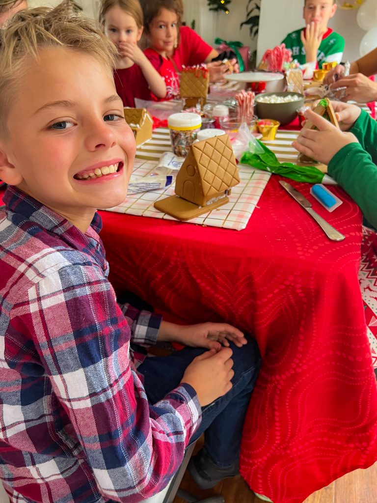 As I like to do with all my kids parties, I split the party venue (ie my home) into 3 different “zones.” I originally was going to have the decorating zone setup on the back patio, but we had an unseasonably HOT and disgusting humid day out of the blue so I didn’t want to put any of the party guest through that. Plus, I doubt anyone would have had success keeping their gingerbread houses together in melty, moist weather.