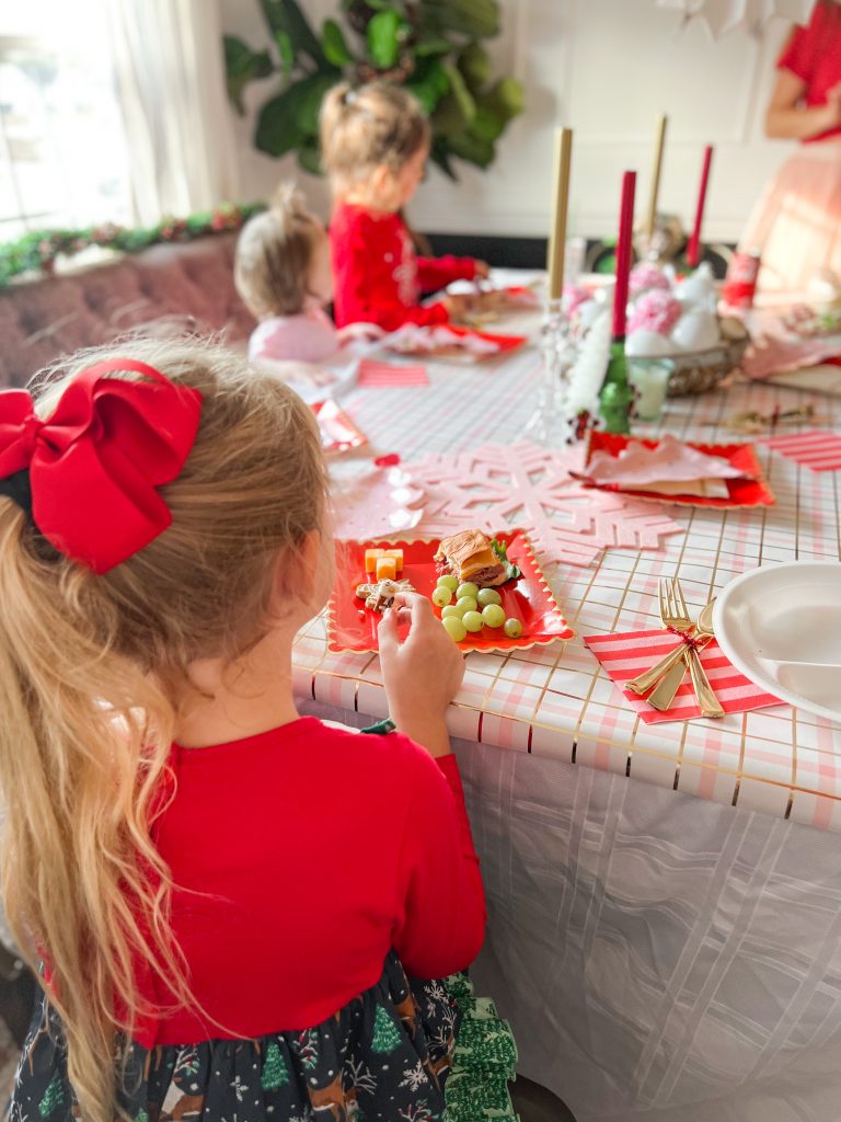 After everyone was done decorating their gingerbread houses, I told everyone to leave them in their places to dry and to grab a plate to eat. The dining room was transformed into a whimsical dining wonderland with a hot chocolate and treats bar cart and adorable table settings. I have everything I used linked for you down below so scroll on down to shop them!