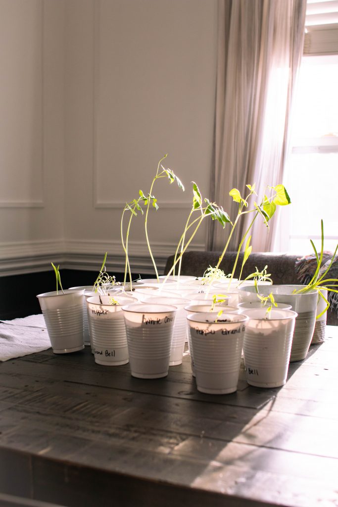 Over time, as the seeds germinate, some will burst growth and need a larger space for roots. I use solo cups as a transition from small space to garden. I drill three holes in the bottom of each cup for drainage and use nutrient rich soil for replanting. Some seeds sprout later than others. My green beans this year have burst out ahead of everything and are basically little mini bean stalks already.